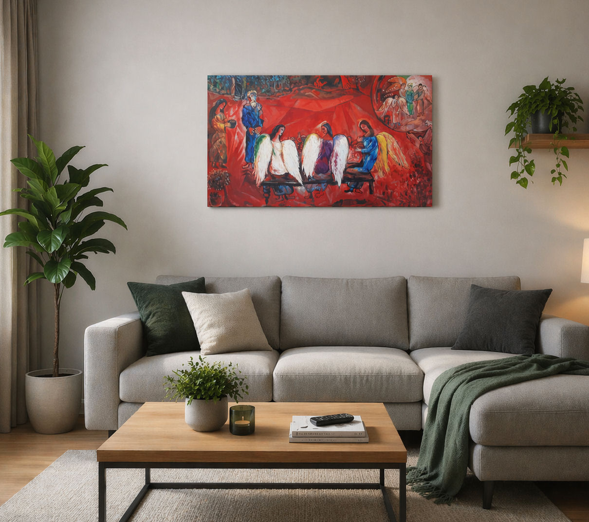 Obraz olejny "Abraham i trzej aniołowie" namalowany na podstawie dzieła Marc'a Chagall'a.