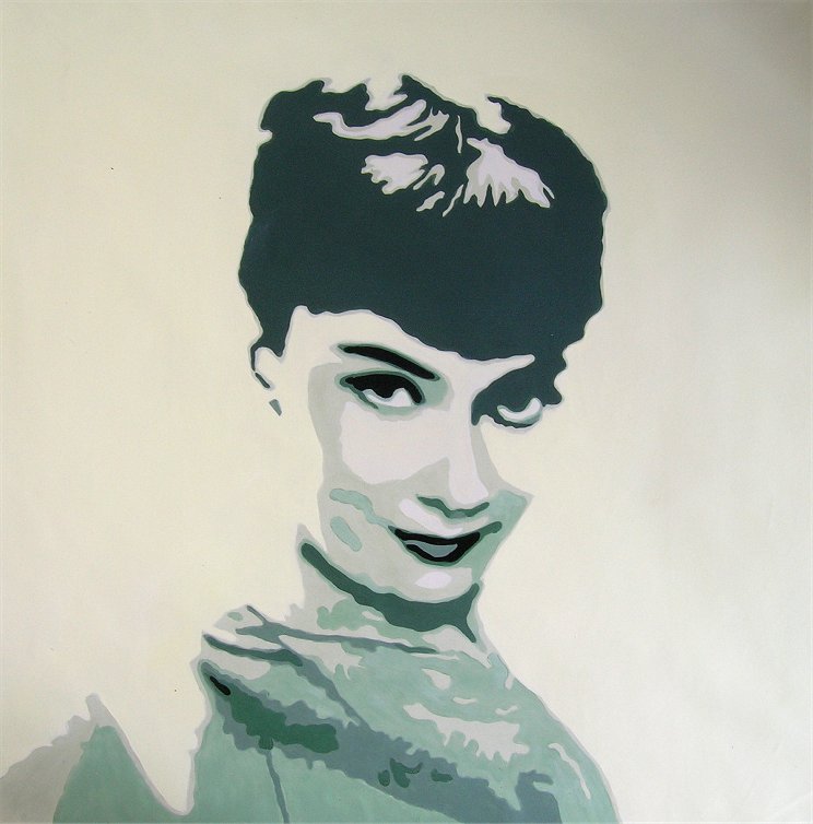Namalowany ręcznie farbami olejnymi na płótnie. Na obrazie przedstawiony jest wizerunek Audrey Hepburn.