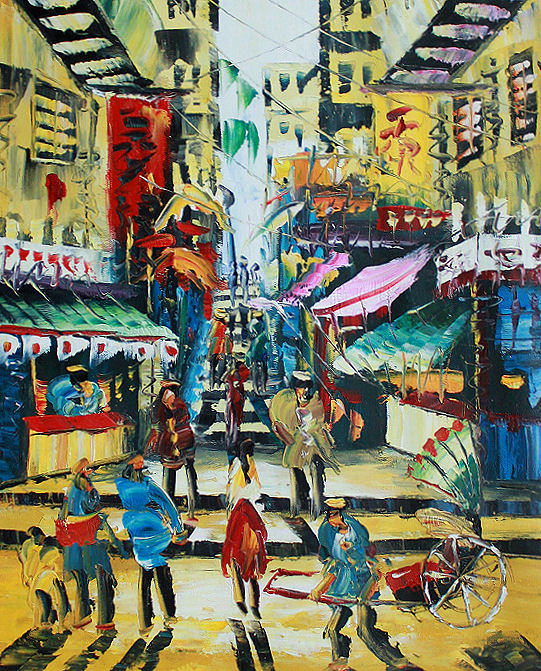 Obraz impresjonistyczny, namalowany w bardzo ciekawy sposób, przedstawiający codzienne życie w chińskiej dzielnicy.