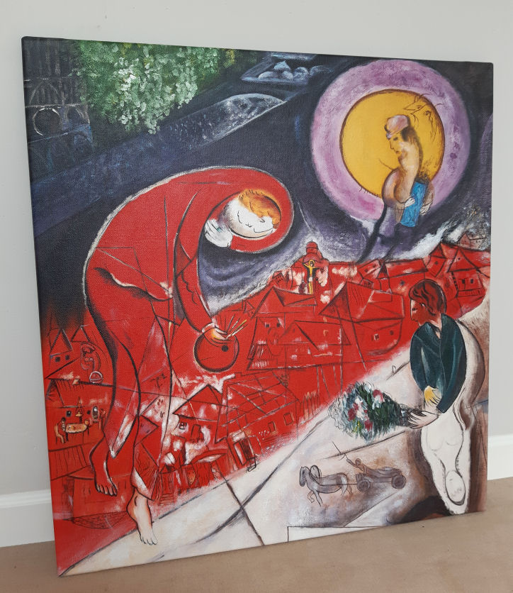 Obraz olejny "Czerwone dachy" namalowany na podstawie dzieła Marc'a Chagall'a.