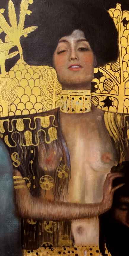 Piękny ręcznie namalowany obraz na podstawie dzieła Gustava Klimt pt. "Judyta z głową Holofernesa".