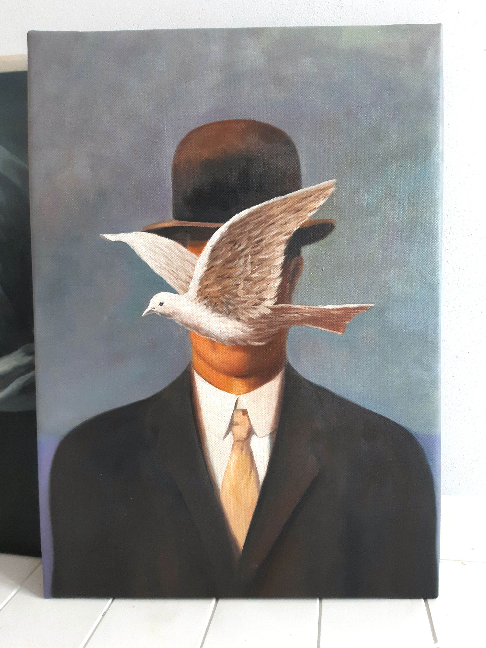 Obraz olejny pt. "Mężczyzna w meloniku" namalowany na podstawie dzieła Rene Magritte.