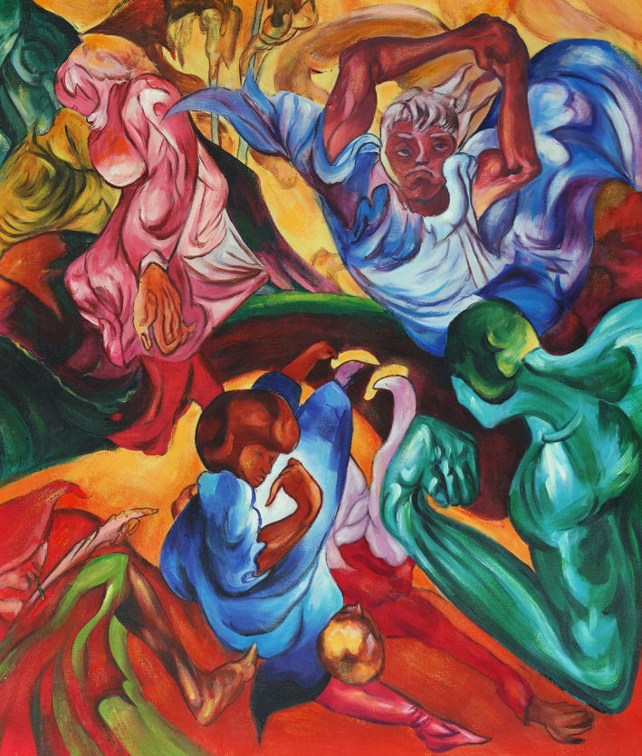 Obraz olejny będący ręcznie namalowaną kopią dzieła artysty Stanisława Witkiewicza pod tytułem "Ogólne zamieszanie".