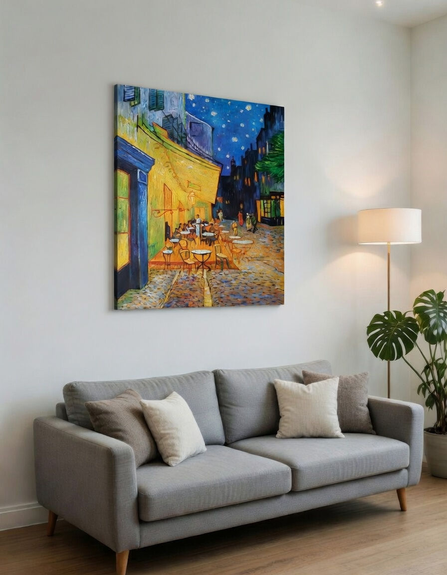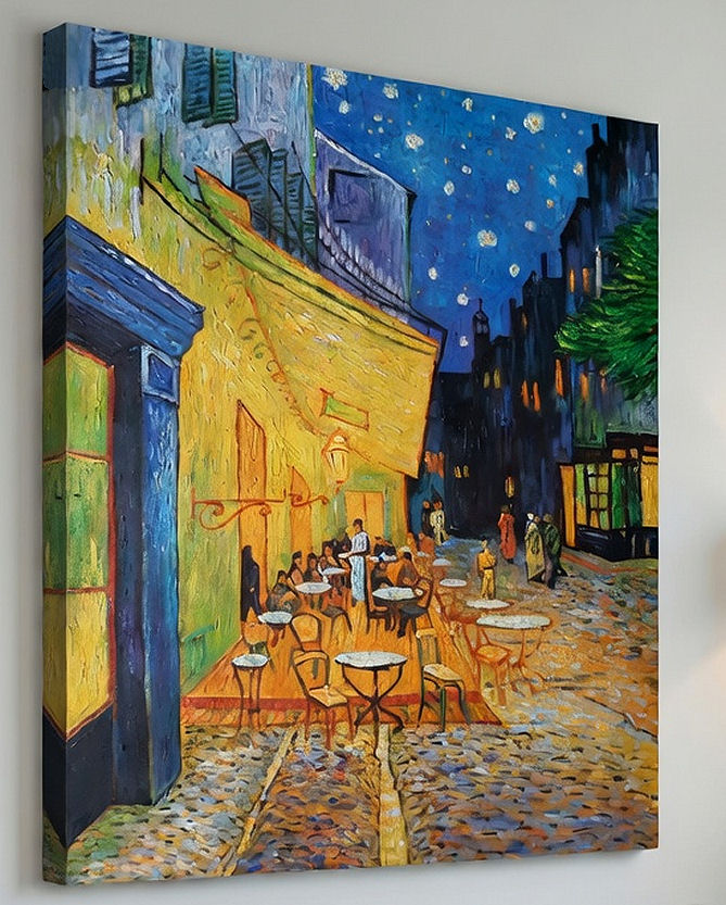 Taras kawiarni w nocy" namalowany ręcznie na podstawie dzieła Vincenta van Gogha.