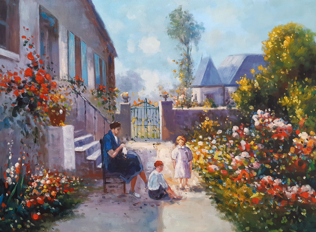 Ręcznie namalowany obraz na podstawie dzieła malarza Edouard'a Crotes'a pt. "W ogrodzie".