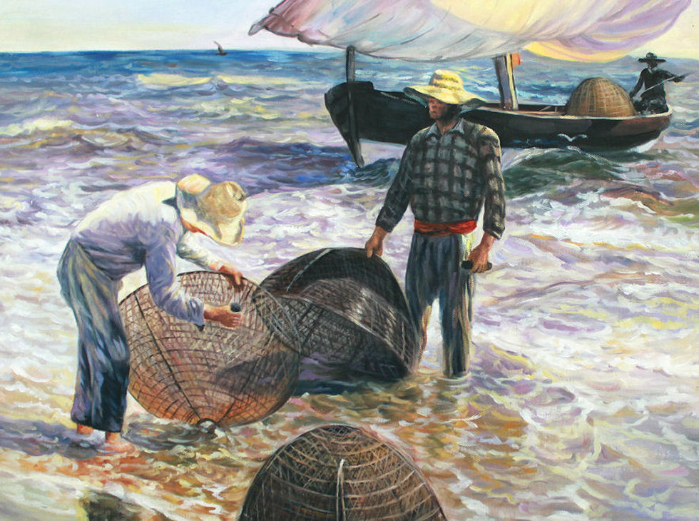 Ręcznie namalowany obraz na podstawie dzieła Joaquina Sorolli, pt "Walencyjscy rybacy".