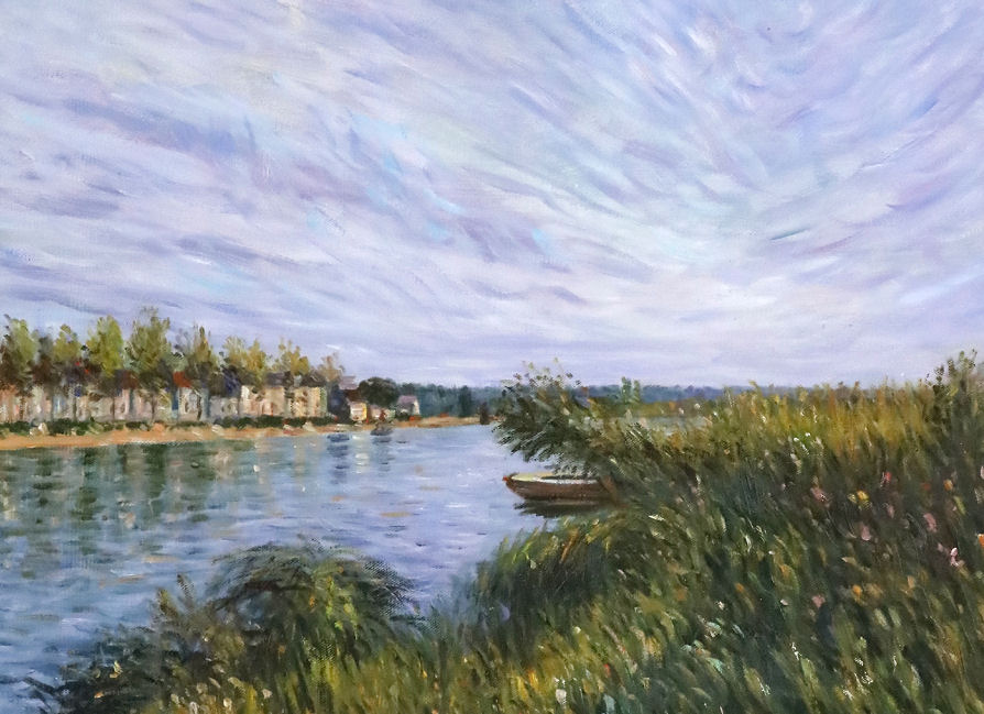 Ręcznie namalowany obraz na podstawie dzieła Alfreda Sisley pt. "Widok na Saint-Mammes".
