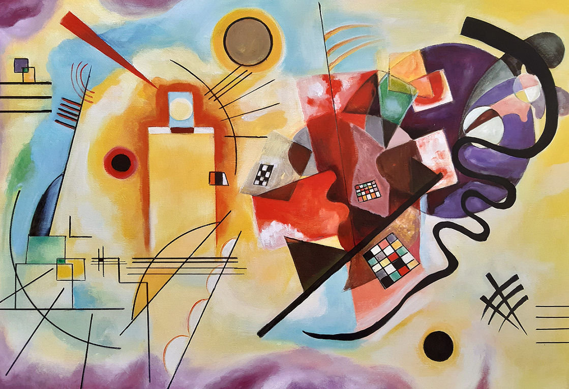 Obraz olejny pt."Żółty, Czerwony i Niebieski" namalowany ręcznie na podstawie dzieła Wassily Kandinskyego.